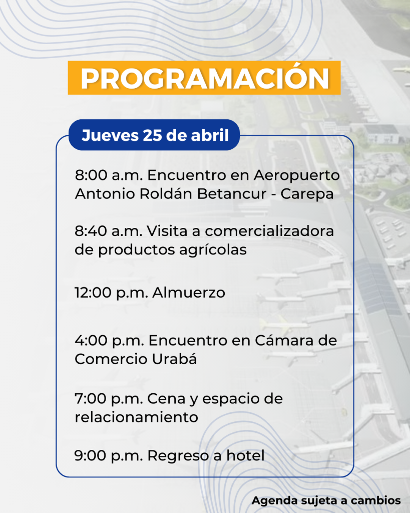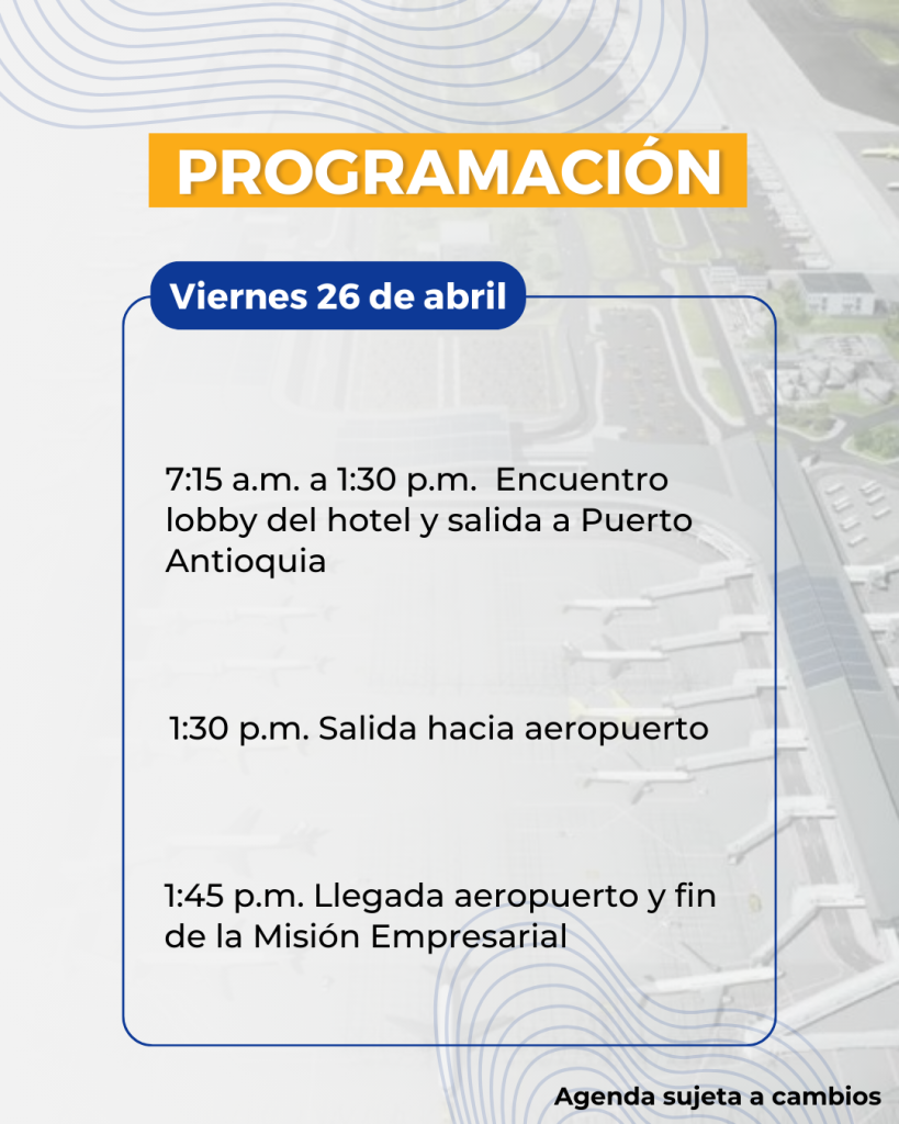 En el mes de abril estaremos visitando la región de Urabá. El objetivo principal es visitar las obras de Puerto Antioquia, y todo el impacto que este proyecto traerá no solo para la región sino para todo Colombia. Puerto Antioquia responde a la necesidad de materializar una infraestructura portuaria de gran capacidad operativa y tecnológica, como complemento perfecto para la ambiciosa apuesta por consolidar un nuevo eje logístico, donde las vías 4G y el impulso a nuevas vocaciones productivas conecten al centro del país con un mundo de nuevas oportunidades.